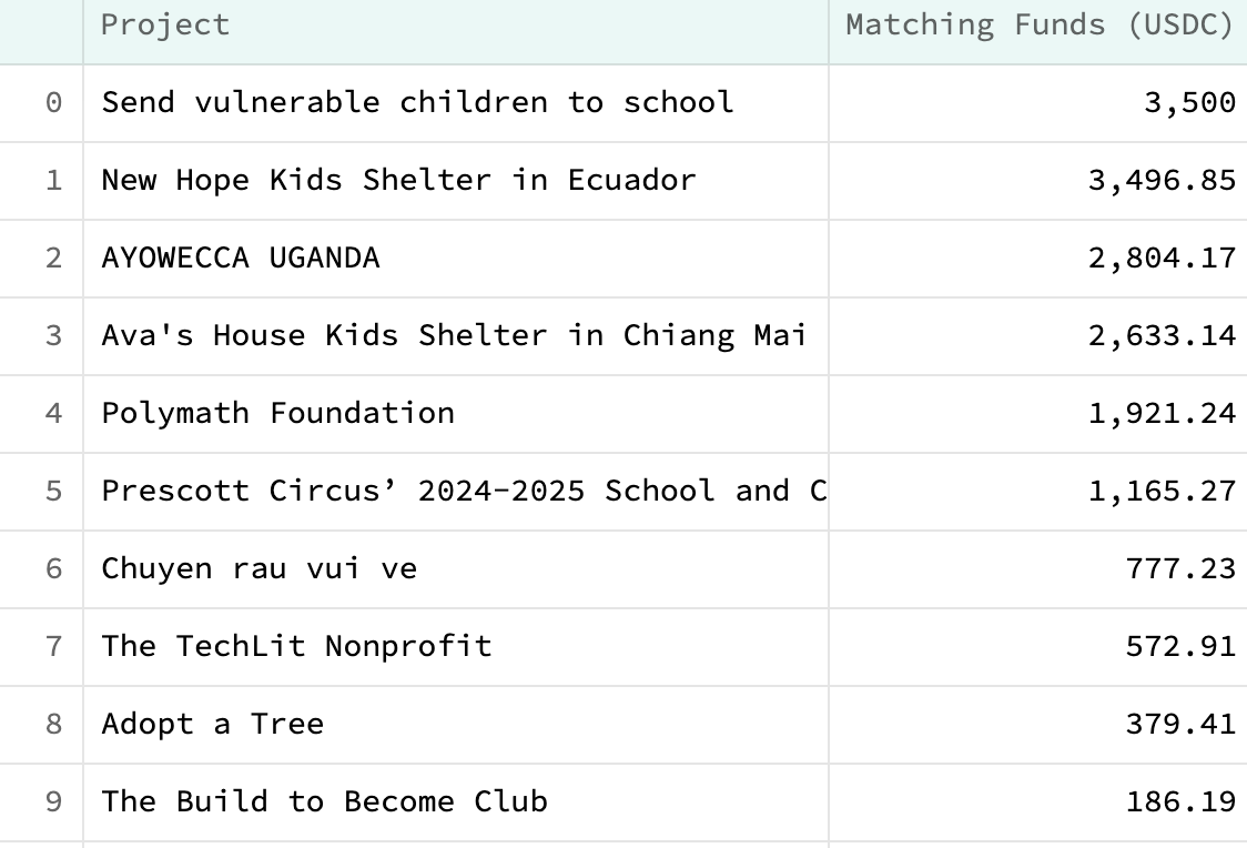 The GG22 Youth in Need round was crowdfunded by 5 individual donors who each contributed $1,000 to create the matching pool, with Gitcoin matching additional funds to support children's shelters and educational projects around the world.